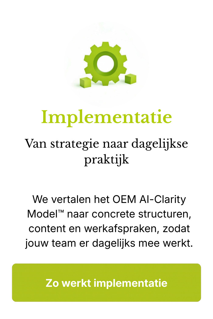 Het OEM AI-Clarity Model™ is ontwikkeld voor marketingteams binnen dienstverleners en kennisorganisaties die inhoudelijk sterk opereren, maar strategisch nog onvoldoende helder communiceren.