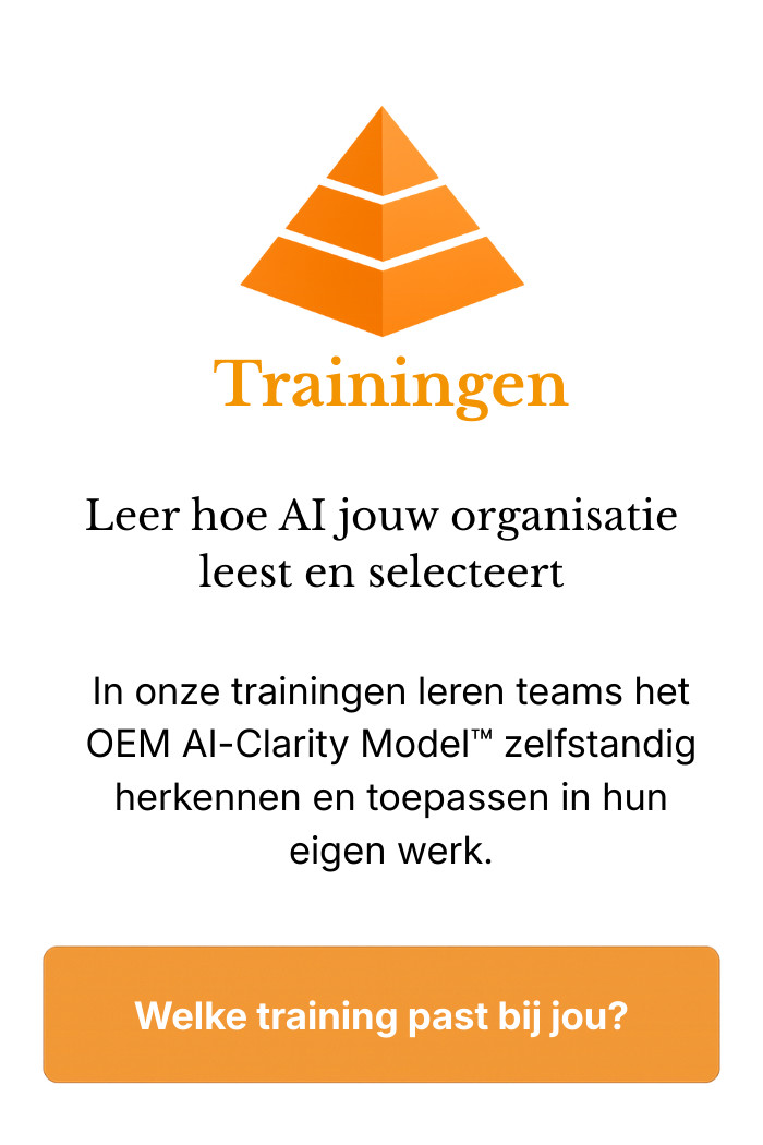Wij gebruiken dit model als vaste methode in al onze trainingen, adviezen en analyses om organisaties AI-begrijpelijk en AI-selecteerbaar te maken.